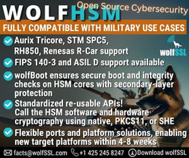 | | | | | | Sponsored | | wolfSSL is FIPS 140-3 validated (Cert #4718), fully compatible with military use cases, and provides open-source cybersecurity. Securing over 2 Billion devices, with support for ASIL D for automotive systems, wolfHSM, and wolfBoot for HSM-assisted secure boot and integrity verification, enhancing security for diverse applications. Visit Booth 839 at AFA Warfare Symposium, Mar 3-5. |